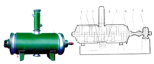 2、耙齒 3、出料裝置 4、加料裝置 5、粉碎棒 6、密封裝置 7、攪拌軸 8、傳動(dòng)裝置 |